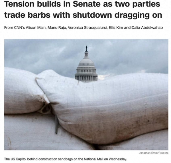 CNN报道,参议院内形势紧张,临时拨款法案再次未获通过,政府关门进入第二周,双方陷入僵持。