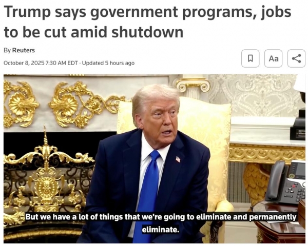 路透社报道,特朗普10月7日表示,由于政府持续"停摆",白宫计划取消一些政府项目,他将在未来几天公布裁员细节。