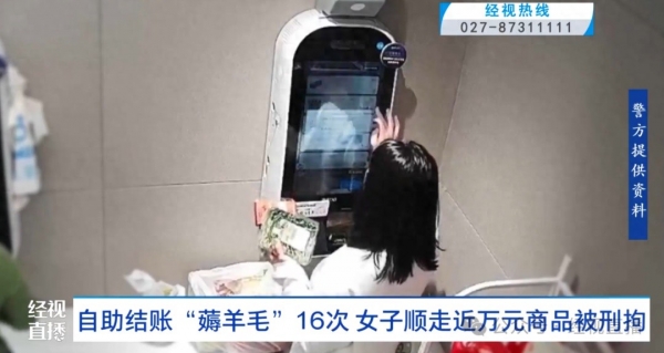 现在很多超市都安装了自助结账设备,方便顾客结算。武汉一名女子竟然觉得自助结账系统存在"漏洞",先后16次去超市"薅羊毛"、顺手牵羊。她没想到的是,自己的行为全部被自助结账设备记录了下来。
