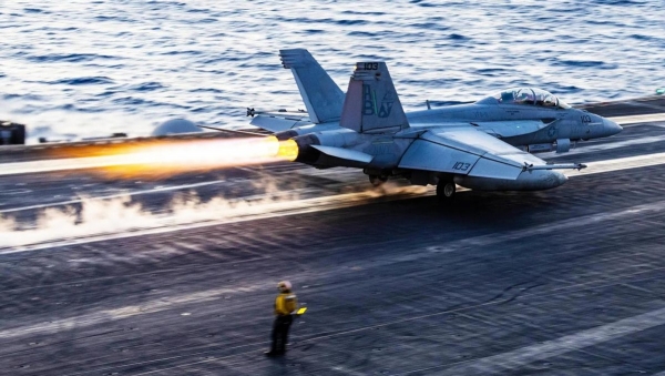 第22战斗机攻击中队的F/A-18F"超级大黄蜂"战斗机,同样是在起飞过程中出现意外,一头扎进海里,两名飞行员紧急弹射逃生。
