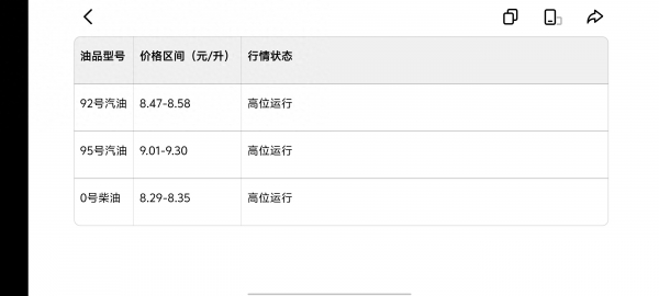 - 92号汽油:8.47-8.58元/升,北京、广东等地直奔8.5元以上,彻底站稳8元时代;