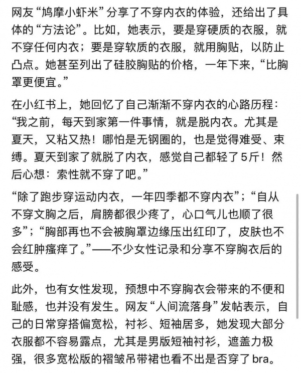 在网络上,一些女性表示她们已经习惯全年不穿内衣。一开始,她们可能会感到有点不好意思,但随着时间推移,这种感觉逐渐消失。她们发现,摆脱内衣后的自由和舒适感是不可替代的。只要挑选合适的服装,再配上胸贴,就不用担心走光的问题。