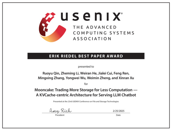 据报道,这篇获奖论文由清华大学计算机系教师章明星、武永卫、郑纬民团队和月之暗面公司合作发表,名为"以键值缓存为中心的以存换算大语言模型推理架构"(Mooncake: Trading More Storage for Less Computation-A KVCache-centric Architecture for Serving LLM Chatbot)。论文的第一作者为计算机系博士生秦若愚,导师为助理教授章明星。
