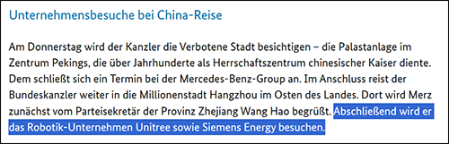另据此前德国总理府网站公布的访华行程,默茨将在杭州访问中国机器人企业宇树科技以及德国企业西门子能源。