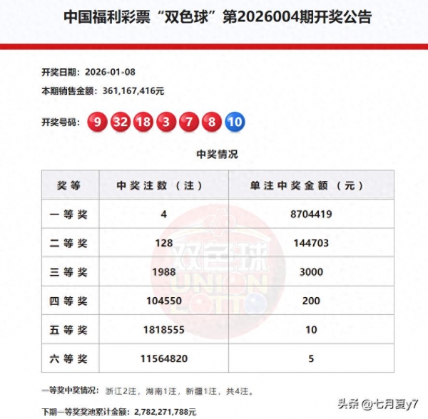昨日晚21:15,中国福利彩票"双色球"第2026004期开奖,全国投注额3.61亿元,奖池在计奖后升至27.82亿元,继续处于历史高位。