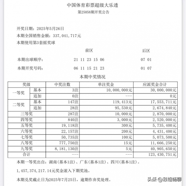 大乐透第25058期开奖详情中显示,当期开奖号码是:06 11 15 21 23-01 07,当期一等奖总计开出3注,单注奖金高达1000万元,二等奖也高开147注,单注奖金也高达11.9万多元。