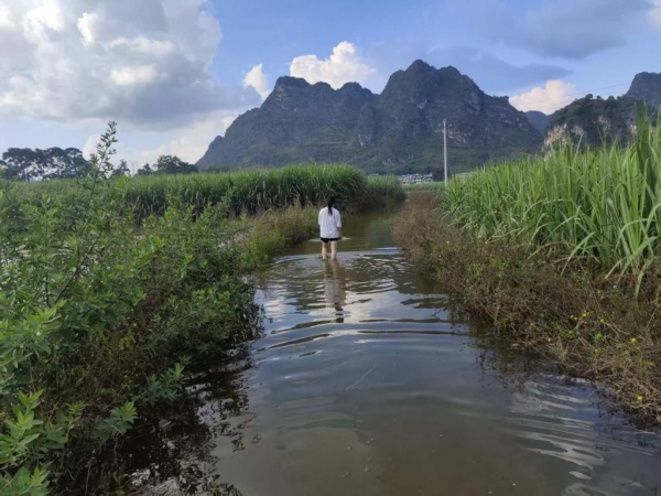 在靖西市武平镇凌爱村承包果园的种植户莫刚凡这十来天也不好过。他的果园有100亩,种有砂糖橘、沃柑、脐橙等品种,如今三分之一仍泡在水里。