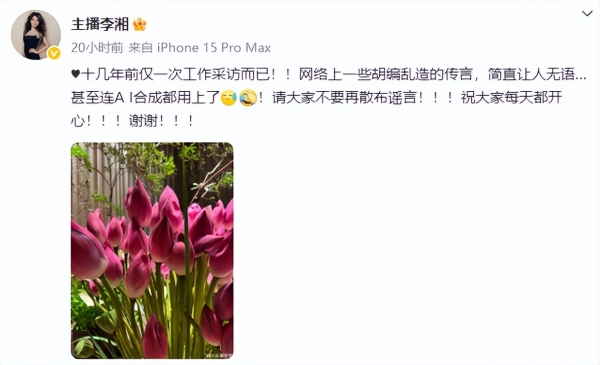 她直言网络上那些胡编乱造的传言毫无根据,令人无语,并特别指出造谣者连 AI 合成技术都用上了,暗指那张亲吻手背的照片是伪造的,最后李湘呼吁大家不要再散布谣言,同时送上祝福,希望大家每天都能开心。