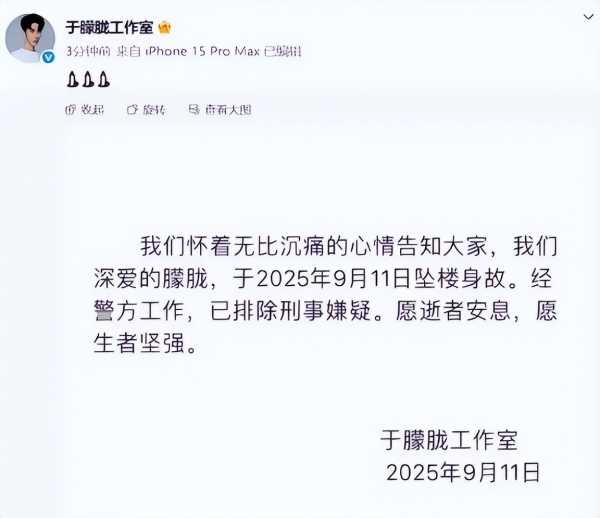 于朦胧的工作室发布的讣告,看上去滴水不漏,里面的内容很简单,短短四个字"坠楼身亡",似乎已经表明了他的死因。后面再加上一句"经警方工作,已排除刑事嫌疑",这讣告就是要告诉大家,于朦胧的死跟任何人都没有关系,既然已经排除了刑事嫌疑,那就没有谁会为这个事情负责。