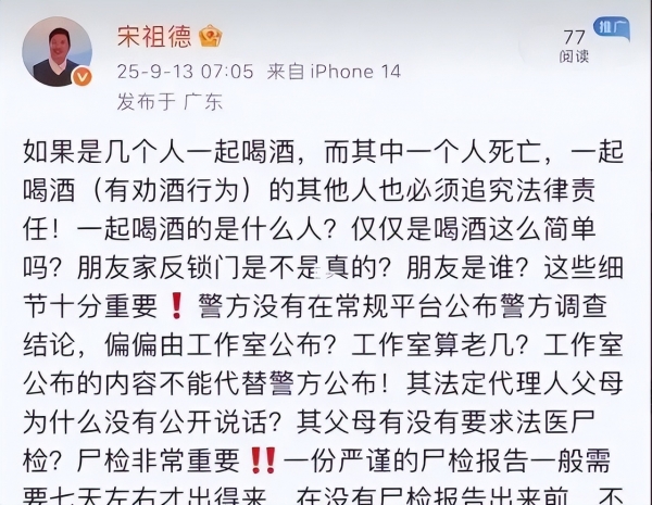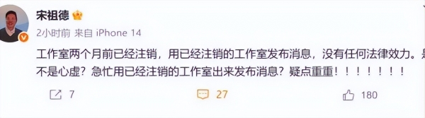 对于工作室发布的这个讣告,宋祖德第一个出来质疑,他说这个工作室两个月前就已经注销了,用一个已经注销的工作室来发布消息是没有任何法律效力的。他的工作室为何突然注销了,他死了,这个已经注销的工作室,为何还要发声,真是疑点重重。