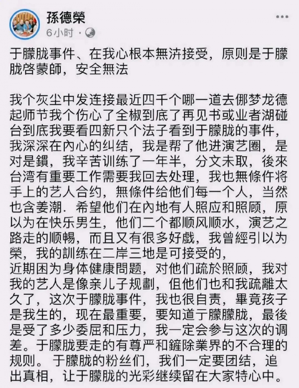 于朦胧的前经济人孙德荣也出来悲痛发声,说他无法接受于朦胧离开的现实,他是于朦胧的启蒙老师。当初是他带着于朦胧进入这个圈子的,他带于朦胧的时候是一分钱也没收,,他就是看好于朦胧这个人,他也把于朦胧当做是自己的孩子。他呼吁于朦胧的粉丝,大家要团结起来追查真相。