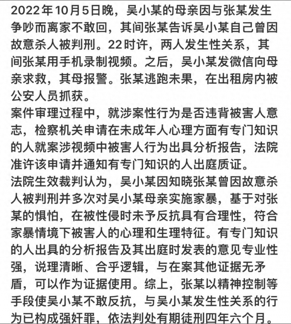 据悉,2022年7月,17岁的吴小某(化名)前往某市与母亲、继父张某共同生活,期间多次从母亲口中得知并亲眼目睹张某对母亲实施家庭暴力,长期处于恐惧氛围中。2022年10月5日晚,吴小某母亲因与张某争吵不堪忍受离家避祸,独自留在家中的吴小某遭到张某进一步威胁--张某主动告知其曾因故意杀人被判刑,以此强化心理震慑。当晚22时许,张某强行与吴小某发生性关系,还全程用手机录制视频,事后吴小某第一时间微信向母亲求救,母亲报警后,张某逃跑未果被当场抓获。