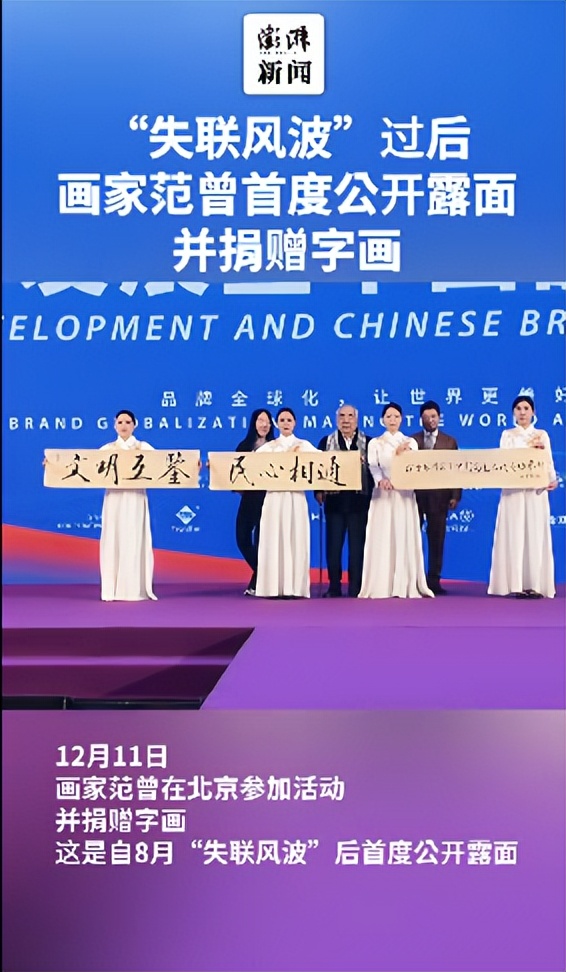 此前,据澎湃新闻,12月11日,画家范曾在北京参加活动,并捐赠字画。这是他自8月"失联风波"后首度公开露面。会后,范曾先生接受澎湃新闻专访,独家回应近况,其称"最近生了独子,搬了新家,是一个非常愉快、非常幸福的家庭。"