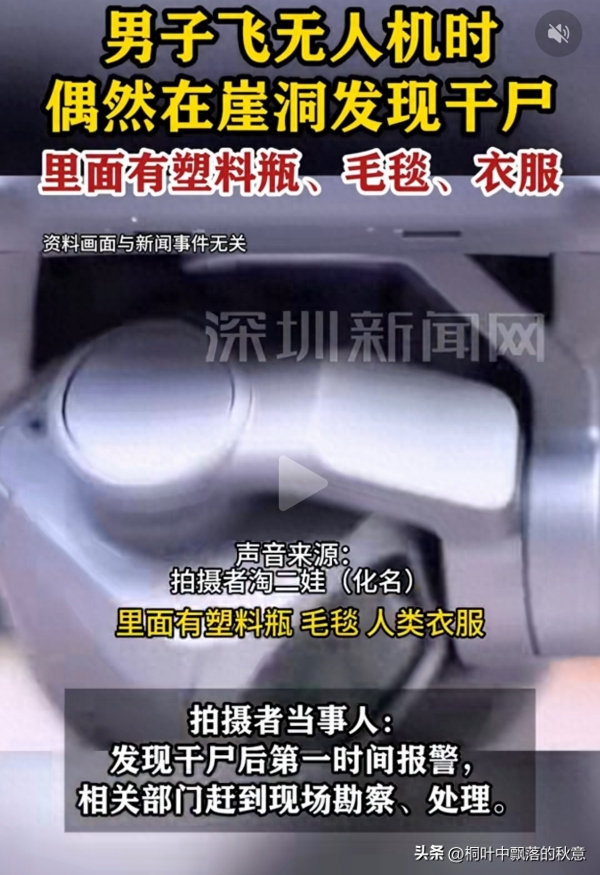 事发时这位兄弟正跟往常一样,操控无人机在户外找角度拍风景。重庆山多崖洞多,他也没特意往险处飞,就正常逛着玩。结果无人机往远处飘的时候,镜头突然扫到一处崖壁中间的洞穴--黑黢黢的山洞里,居然躺着具干尸!旁边还扔着塑料瓶、旧毛毯、穿得破破烂烂的衣服……