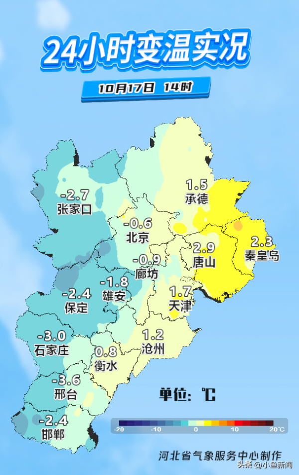 更厉害的还在后头,19-20日早晨,河北大部分地区最低气温将下降10~12℃,妥妥的要霜冻了。张家口和承德更"优秀",直接下降13~15℃,连冰冻都安排上了。想象一下,20日早晨,坝上地区最低气温-10~-6℃,其他地区-5~4℃,这酸爽,简直不敢想!