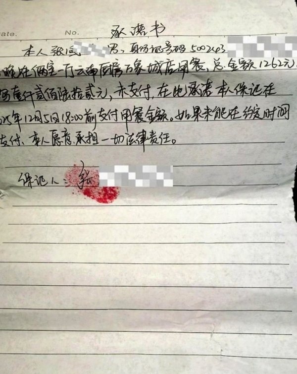 张某当晚押了身份证,写下承诺书,约好第二天六点前付清,还说愿承担法律责任,这一笔字,是他自己给自己留的台阶