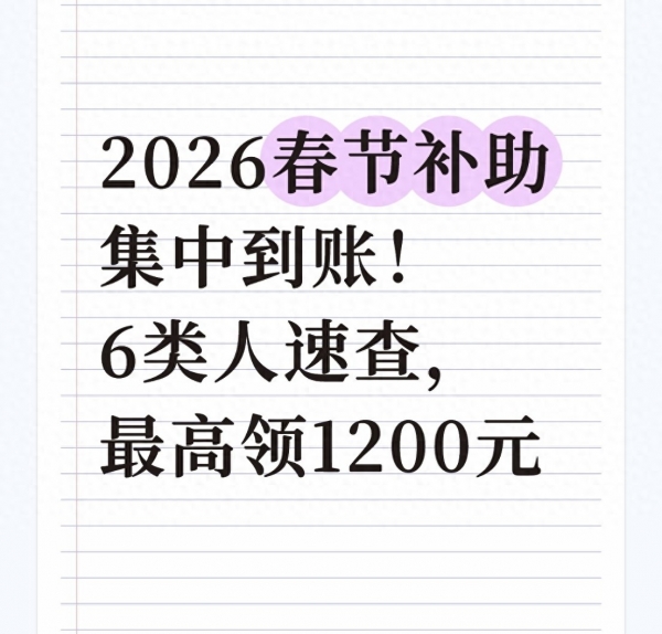 年关将至,年味渐浓,一笔带着暖意的"过年红包"已开始集中到账!2026年春节补助按照国家"应保尽保、精准帮扶"的部署,由各地民政、财政等部门联合发放,专门瞄准需要帮扶的困难群体,不用抢、不用拼手速,符合条件的直接打入户头账户。最高能领1200元,还有米面油、棉被等实物福利,1月集中发放,春节前全部到位。今天就用大白话把谁能领、领多少、怎么查讲透,别错过这份暖心福利!