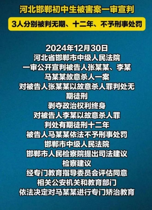 2024 年 3 月 10 日,河北省邯郸市发生的一起 "初中生杀人埋尸案",刺痛了无数人的心。如今,这起案件有了一审宣判结果。