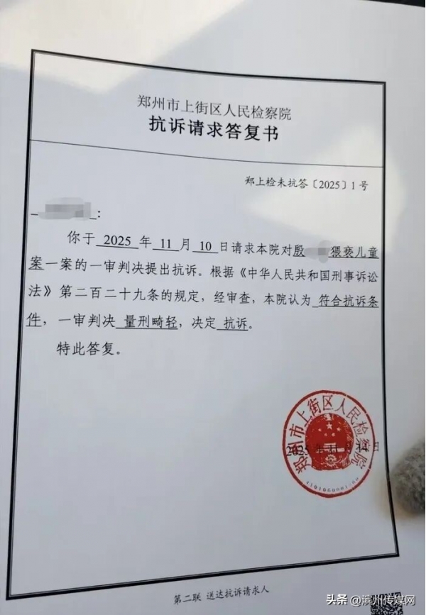 "一审判决后,我们认为量刑畸轻,向检察院申请抗诉,检察院支持了我们的抗诉请求。"19日,王女士告知记者,她已收到来自郑州市上街区检察院的抗诉请求答复书,"答复书里,检方也认为一审判决量刑畸轻,决定抗诉。"
