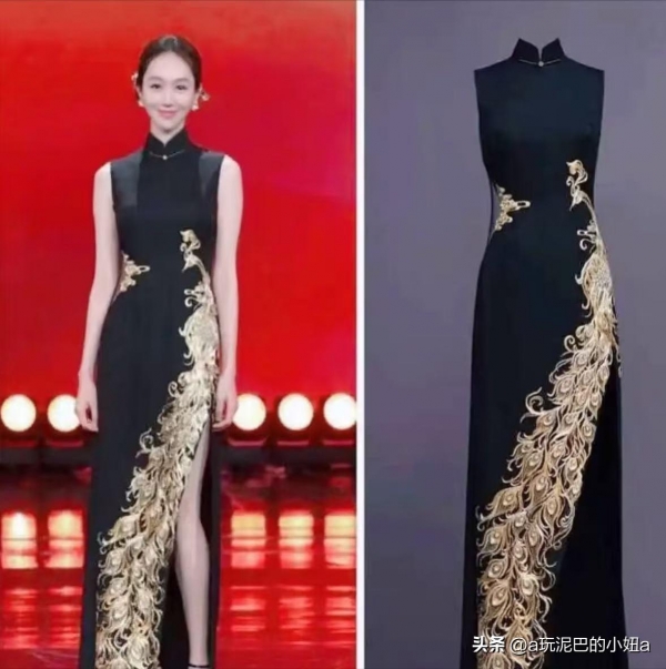 黑色布料上"栩栩如生"的金凤凰,几乎贯穿整条旗袍。