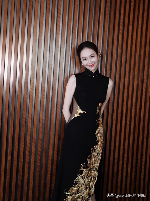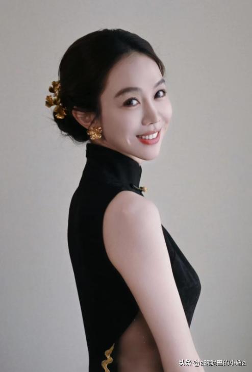 整件旗袍的黑金配色,显得姜妍的皮肤更加白皙。