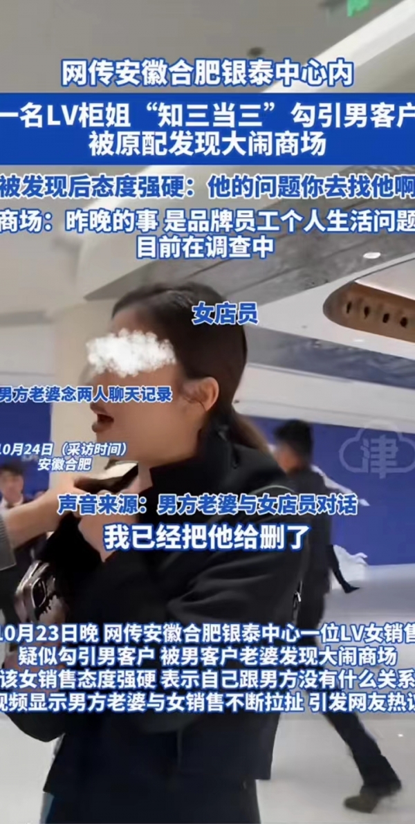 据津云报道,近日合肥银泰中心一名LV柜姐被指勾引男客户,原配掌握了二人的聊天记录,赶到商场揪住这名LV柜姐的衣领不放,讨要说法。