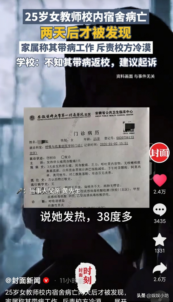 2026年1月的小寒节气里,安徽合肥一家技校宿舍楼发生的事闹得人心惶惶,女老师在学校宿舍病亡,事情要从25岁的小如老师说起,她去年刚从这所学校毕业,转眼就当上了班主任。