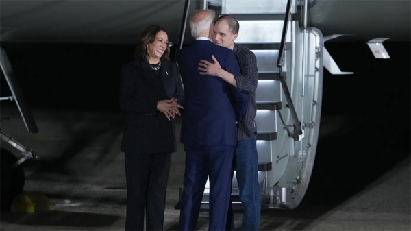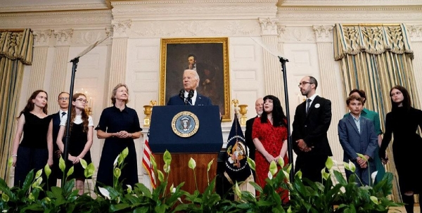 (拜登就交换囚犯发表讲话,身边站着的都是被交换囚犯的亲属)