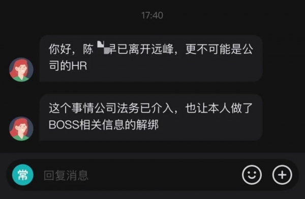 远峰科技HR在招聘软件告诉记者,陈某离职很久,不是远峰科技HR团队成员。目前已经要求陈某解绑远峰科技招聘软件权限,公司法务已经介入。