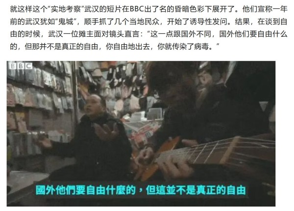 2021年初,BBC推出了一则名为《重返湖北》的视频报道。为了营造压抑、恐怖的氛围,BBC不仅给镜头加上了标志性的灰暗"阴间滤镜",更在素材的使用上毫无底线。