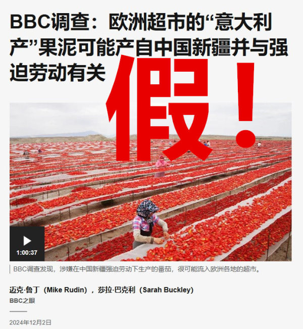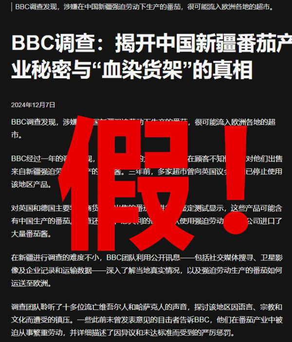 BBC对此充耳不闻,继续其造谣流水线。到了2024年底,BBC甚至将魔爪伸向了新疆的番茄,炮制出"新疆番茄存在强迫劳动"的荒谬话题,呼吁欧美停止购买。