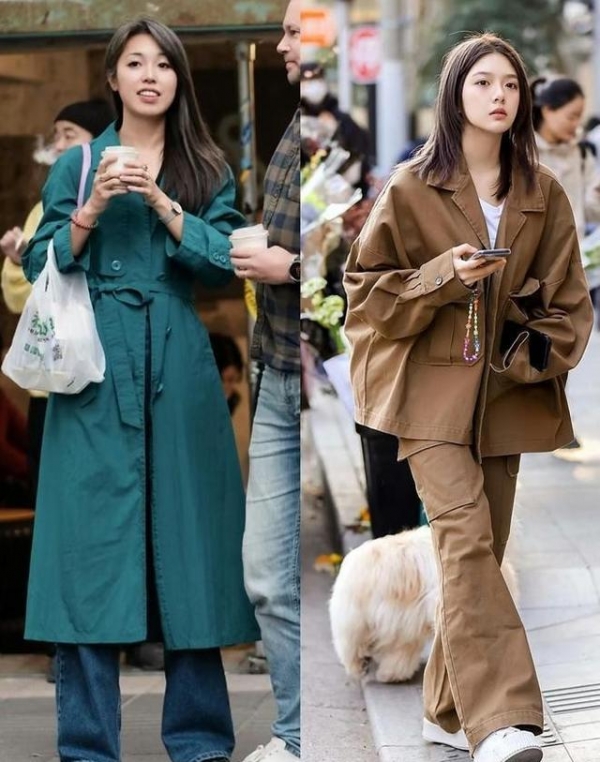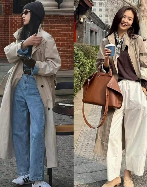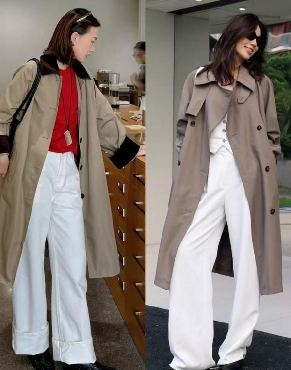 我前两天在地铁里看到一个女生,米色风衣敞开,里面是件白衬衫,腰线被刻意系出一道弧度,裤脚是那种微微收束的微锥阔腿,走起来像风推着云。