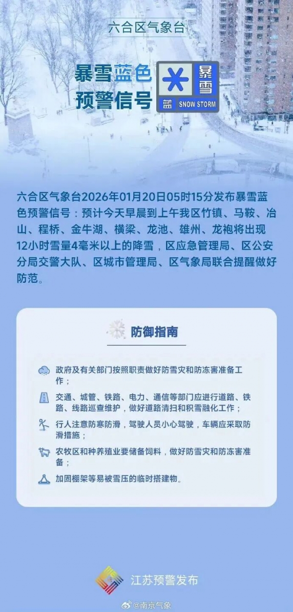 六合区气象台2026年01月20日05时15分发布暴雪蓝色预警信号:预计今天早晨到上午,竹镇、马鞍、冶山、程桥、金牛湖、横梁、龙池、雄州、龙袍将出现12小时雪量4毫米以上的降雪,区应急管理局、区公安分局交警大队、区城市管理局、区气象局联合提醒做好防范。
