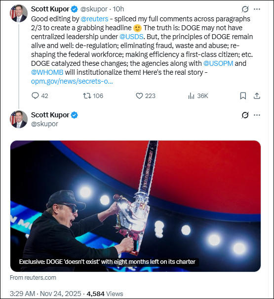 "真相是:数字服务局(USDS)旗下的DOGE或许没有集中式领导,但其核心原则始终鲜活且有效:放松监管、打击欺诈、浪费与滥用行为、重塑联邦职员体系、将效率视为重中之重等。DOGE推动了这些变革落地,后续各政府机构将联合OPM与白宫管理与预算办公室(OMB),将其正式制度化!这才是事情的真相。"