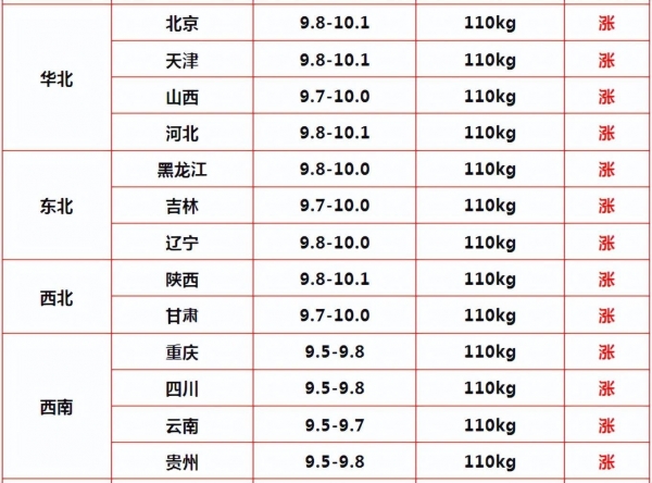 具体到各地区,华东地区的山东上涨0.2元/斤,生猪出栏参考价达到9.7~10.2元/斤;华中地区的河南上涨0.3元/斤,标猪出栏参考价9.7~10.1元/斤;华南地区的广东上涨0.2元/斤,标猪出栏参考价10.1~10.4元/斤;华北地区的河北上涨0.2元/斤,标猪出栏参考价9.8~10.1元/斤;东北地区的吉林上涨0.1元/斤,生猪出栏参考价9.7~10.0元/斤。