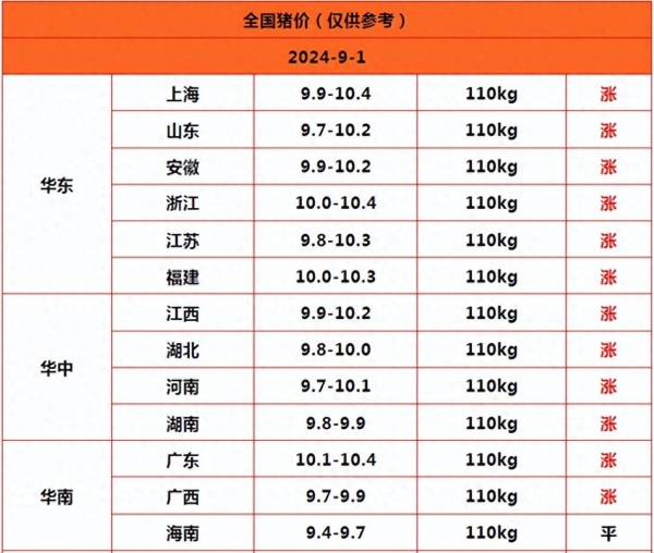 不少大型猪企纷纷上调挂牌价。比如,牧原在河南上调了0.60-0.55元/公斤,温氏在广东也上调了0.2元/公斤。这一波涨价,让全国猪价都快逼近10元/斤了。