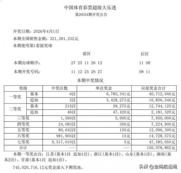 结果揭晓,全国共中出 6注一等奖。其中4注为基本投注,单注奖金 678万;另外2注采用了追加投注,每注多得追加奖金 542万,单注总奖金直接冲到 1220万。