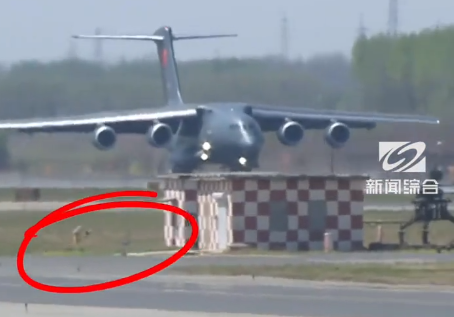 4 月 22 日 11 时 25 分左右,运 - 20B(国产涡扇 - 20 发动机、呼号 "荣归 50")主起落架触地、平稳降落的瞬间,直播镜头对准跑道,飞机正缓缓接地、打开反推减速;一只喜鹊突然从画面左侧飞入,掠过机身前方、横穿镜头,短暂定格后飞离,恰好与 "英雄回家" 的庄重时刻同框。