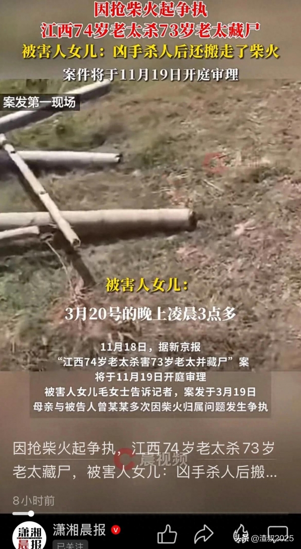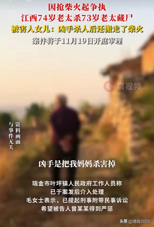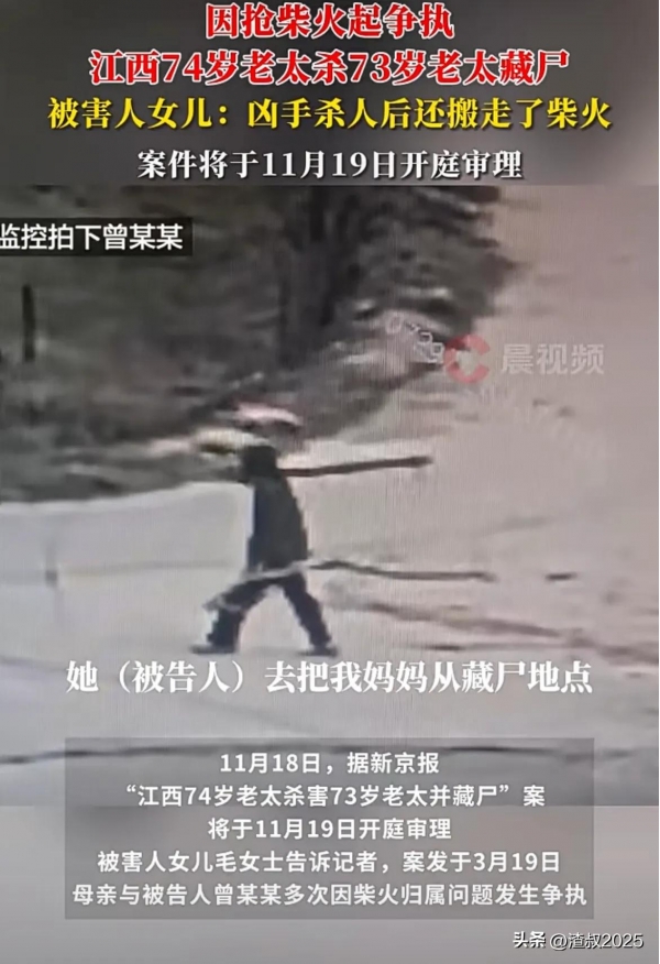 11月18日,据新京报"江西74岁老太杀害73岁老太并藏尸"案,将于11月19日开庭审理,被害人女儿毛女士告诉记者,案发于3月19日,母亲与被告人曾某某多次因柴火归属问题发生争执!