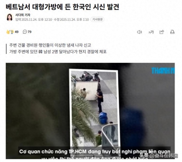 据越南当地媒体报道,在越南胡志明市某居民区发现了一个装有韩国男性尸体的行李箱。