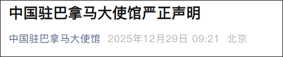 微信公众号"中国驻巴拿马大使馆"12月29日消息,针对巴拿马阿赖汉市政府在未作任何事前通知、且未与华人社团进行沟通的情况下拆除象征中巴人民友谊的中巴公园及华人抵巴150周年纪念碑一事,中国驻巴拿马大使馆发表严正声明。全文如下:
