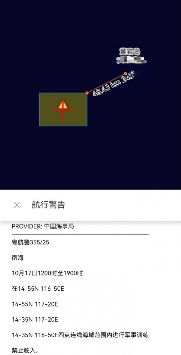 (从地图看航行警告区域就在黄岩岛附近海域)