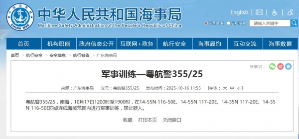 中国政府对黄岩岛的"实质管辖"再进一步!广东海事局发布的"粤航警355/25"航行警告显示,10月17日12时到19时,在南海四点连线海域范围内有军事训练,非相关船只禁止驶入。根据经纬度坐标可以发现,这个航行警告区域就在黄岩岛的西南方向,直线距离不到50公里。