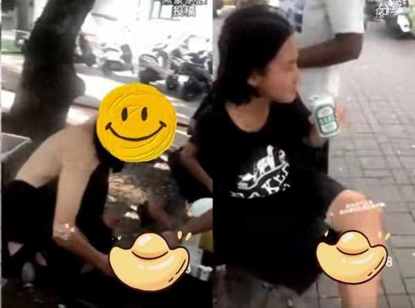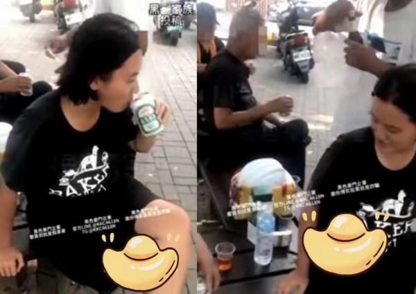 视频拍摄于公园,林靖恩身穿黑色短袖,与几位中年男子围坐在一张石桌旁,桌上摆放着啤酒和零食。