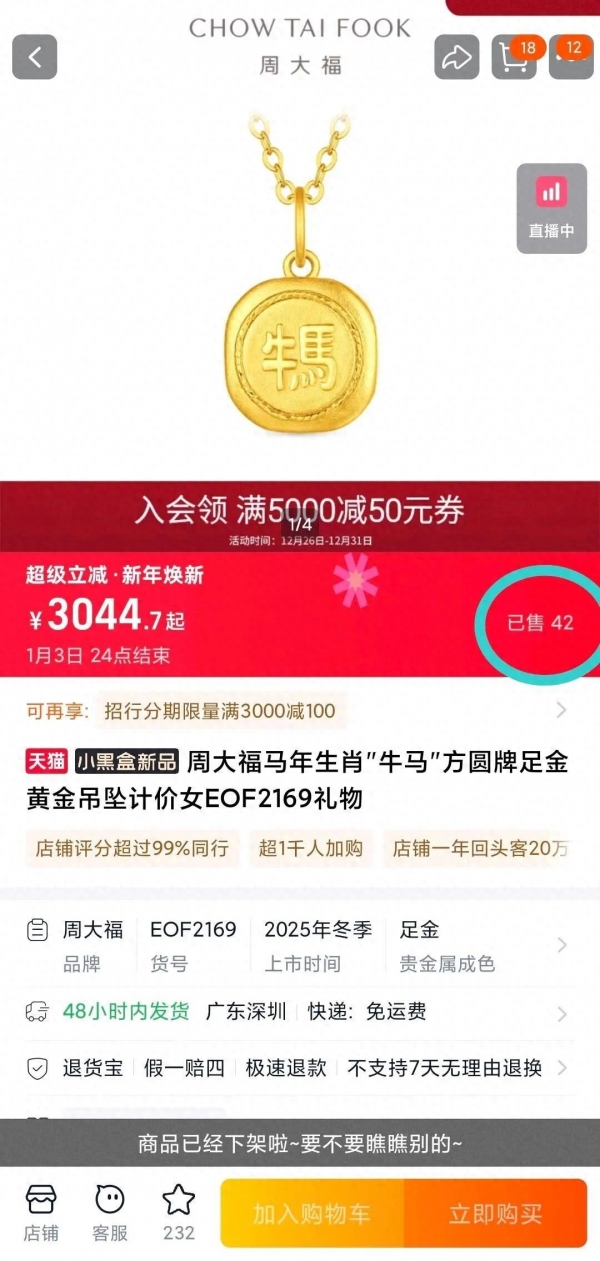 极目新闻记者在两个电商平台的周大福官方旗舰店内,找到这款吊坠的链接,该吊坠的一面是一个牛与马的汉字,另一面则是拼音"jia"。商品价格显示,2.05克黄金吊坠3256.65元,包含360元手工费,另有1.9克、1.95克、2克和2.15克重量的同款吊坠。