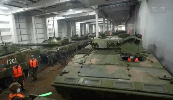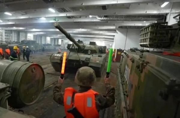 此前根据央视军媒的报道,解放军一次性就在滚装船的一层船舱内运输了上百辆的汽车和坦克装甲车辆。如果是巨型滚装船的3层大型车辆舱,则可以携带数百辆坦克、汽车和装甲车辆,以及数千名解放军官兵。
