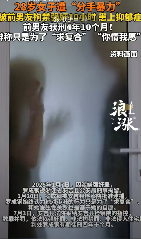 浙江湖州,小叶和男友罗某分手后,罗某踹门闯入她家,非法拘禁了她10个小时,并多次实施强 奸。案发后,罗某否认强 奸,还理直气壮地说:我只是在求复合,她还主动搂我的腰,发生关系是她自愿的!