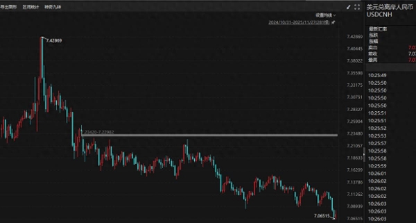 11月26日,美元兑离岸人民币汇率升破7.08关口,创2024年10月14日以来新高;11月27日走势再加速,离岸人民币进一步突破7.07,连续刷新一年来峰值。与此同时,在岸人民币对美元即期汇率同步升破7.09关口,同样创下逾一年新高。