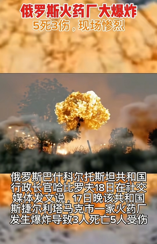 10月17号晚上,俄罗斯巴什科尔托斯坦共和国的夜空突然被炸开了锅,斯捷尔利塔马克市的"先锋"火药厂一声巨响,巨大的蘑菇云冲天而起,几公里外的居民都看得清清楚楚,家里的窗户玻璃直接被冲击波震出裂纹。等烟尘稍微散去,厂区里的一栋生产车间已经变成了废墟,扭曲的钢筋和机器零件散落一地。