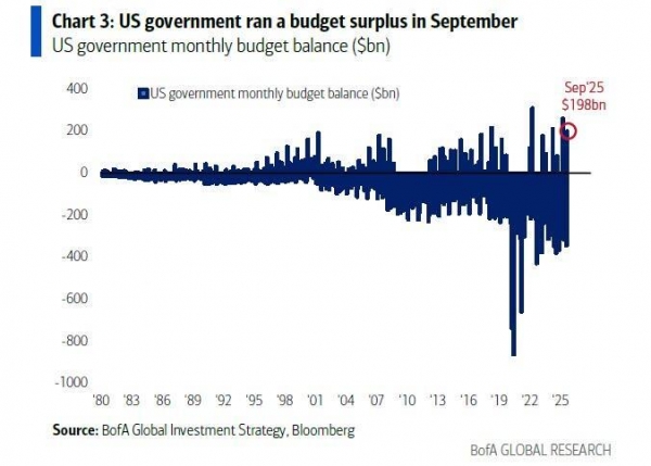 从宏观层面上,Hartnett提出质疑,认为支撑金价的"贬值交易"逻辑并不牢固。他给出了三点理由:第一,10年期美国国债收益率低于4%;第二,美国在9月份实现了预算盈余;第三,衡量美元强弱的美元指数(DXY)始终未能跌破4月份的低点。这些因素共同表明,做空美元、做多黄金的交易基础或许并不如想象中坚实。